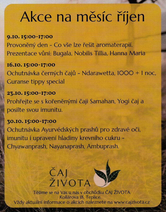 Obchůdek ČAJ ŽIVOTA v Teplicích nabízí během října několik zajímavých akcí zaměřených na čaje a aromaterapii. V úterý 16. října od 15:00 do 17:00 proběhne ochutnávka černých čajů, včetně speciálních variant Ndarawetta a Guranse. Další akce se zaměří na prohřátí s kořeněnými čaji a ochutnávku Ayurvédských prashů pro zdraví. Těšíme se na vaši návštěvu, aktuální informace o akcích jsou k dispozici na našich webových stránkách.