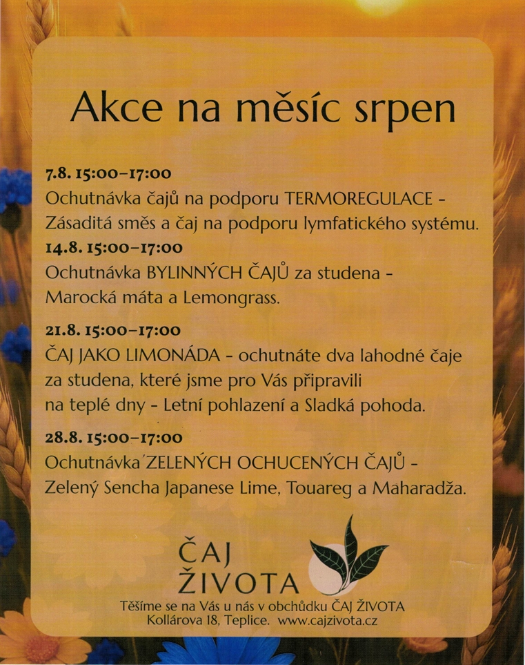 Obchůdek ČAJ ŽIVOTA v Teplicích zve všechny milovníky čaje na ochutnávky, které se budou konat v srpnu. Akce zahrnují ochutnávku čajů na podporu termoregulace, bylinné čaje za studena, čaje jako limonádu a ochutnávku zelených ochucených čajů. Těšíme se na vaši návštěvu a příjemné chvíle strávené s lahodnými nápoji.